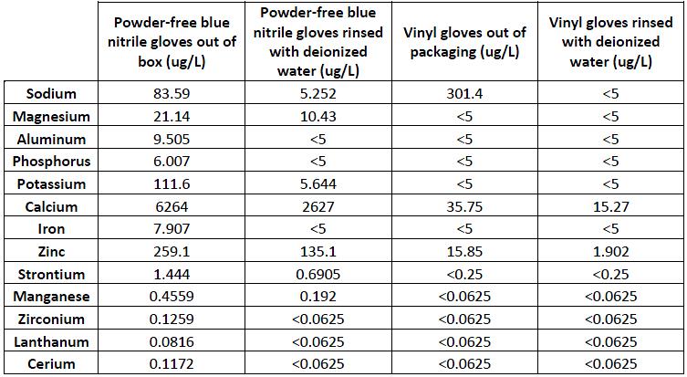 Como en cualquier laboratorio, y especialmente en un laboratorio limpio, los guantes son imprescindibles. Descubrimos que el uso de guantes de vinilo en lugar de guantes de nitrilo sin polvo proporciona un manejo más limpio. Otra práctica que encontramos para ayudar en la limpieza es lavar los guantes con agua desionizada una vez que los guantes se colocan sobre sus manos y antes de usarlos. Una prueba de inmersión en los dedos ayudó a confirmar nuestra observación, como se muestra en el Cuadro 3. Los guantes de nitrilo azul empolvado, recién salidos de la caja, mostraron contaminación de 13 elementos diferentes, mientras que los guantes de vinilo, nada más sacarlos del empaque, mostraron contaminación de solo tres elementos diferentes . En ambos casos, el enjuague de los guantes con agua desionizada disminuyó considerablemente la contaminación.