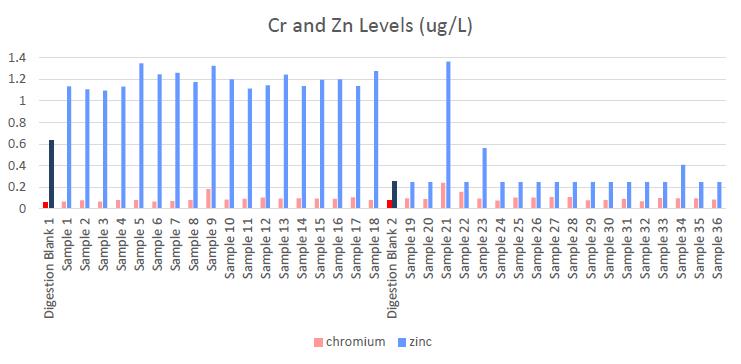 La preparación de la muestra presenta muchas oportunidades de contaminación si no está atento. En el laboratorio, se producen lotes más pequeños de solución de digestión. Dependiendo de cuántas muestras se preparen, se pueden hacer algunos lotes. Cada vez que se elabora un nuevo lote, existe la posibilidad de contaminación. Originalmente, solo se analizó un blanco de solución de digestión al comienzo de toda la serie de muestras. Al revisar nuestros datos, notamos impactos elevados de metales en grupos de muestras. Estos éxitos se correlacionaron con el momento en que se hizo una nueva solución de digestión. Después de este descubrimiento, cada vez que se hace una nueva solución de digestión, ahora procesamos un blanco en un tubo de PFA colocado antes de las muestras asociadas. El tubo de PFA actúa como control contra nuestras copas de polipropileno. Observe el patrón en el gráfico 1 y el gráfico 2. En este caso, la “contaminación” se puede rastrear hasta la solución de digestión. Si bien esto prueba que la contaminación se originó en la solución de digestión y no en el vial, no responde a la pregunta del millón de dólares: “¿De dónde vino en primer lugar?” Esta puede ser la pregunta más difícil de responder cuando se lucha con el análisis de metales bajos. Fue necesario investigar un poco el método de digestión para aclararlo.