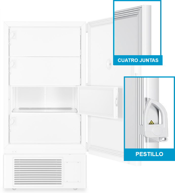 Puerta exterior segura y aislada, cuenta con un sistema de juntas multipunto que crea un sello hermético contra el marco de la puerta del congelador que protege contra la intrusión térmica y reduce la acumulación de escarcha, 1 pestillo con candado.