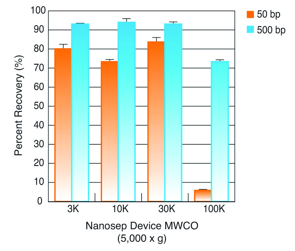Se centrifugó una muestra de 500 μl de una solución de fragmento de ADN de 100 μg/ml que contenía fragmentos de ADN bicatenario de 50 y 500 bp a 5.000 x g en dispositivos Nanosep hasta un volumen final de 50 μl.