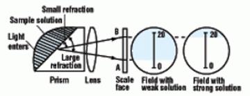 El prisma en el refractómetro tiene un índice de refracción mayor que la solución. Las medidas se leen en el punto donde se encuentran el prisma y la solución. Con una solución de baja concentración, el índice de refracción del prisma es mucho mayor que el de la muestra, creando un gran ángulo de refracción y una lectura baja (“A” en el diagrama). Lo contrario sucedería con una solución de alta concentración (“B” en el diagrama).