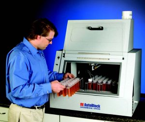 Una vez que los digestores de bloque se utilizaron más ampliamente, la atención se centró en automatizar el procedimiento de digestión. La automatización completa puede requerir cualquier combinación de varios pasos, incluida la adición de varios reactivos de digestión diferentes, generalmente ácidos; calentamiento durante un tiempo específico a una temperatura precisa; cambiando la temperatura de digestión; permitiendo que las muestras se enfríen; y rellenado a un volumen especificado. Agregar la necesidad de controlar los humos y la eliminación de gases en el área de digestión hace que la automatización sea un procedimiento costoso. El AutoBlock Plus (Figura 2) es una solución rentable.