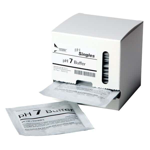 De un solo uso, bolsas herméticas con estándares de calibración de alta precisión. Todas tienen fecha de caducidad y están estandarizadas con referencias trazables NIST para asegurar su calidad. Su exactitud es ±0.01 pH a 25°C. Cada caja contiene veinte bolsas de 20 mL.